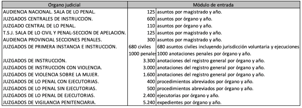 Este módulo servirá como parámetro de medición principal para determinar la carga de trabajo de los órganos jurisdiccionales, y podrá ser complementado con otros criterios derivados de circunstancias ocasionales que afecten de forma puntual a la situación de un juzgado o tribunal, o de realidades socioeconómicas de determinados partidos judiciales que incidan de forma permanente en el tipo de asuntos que ingresan.